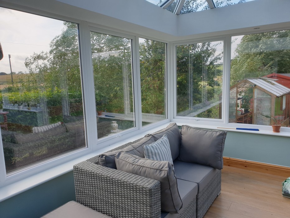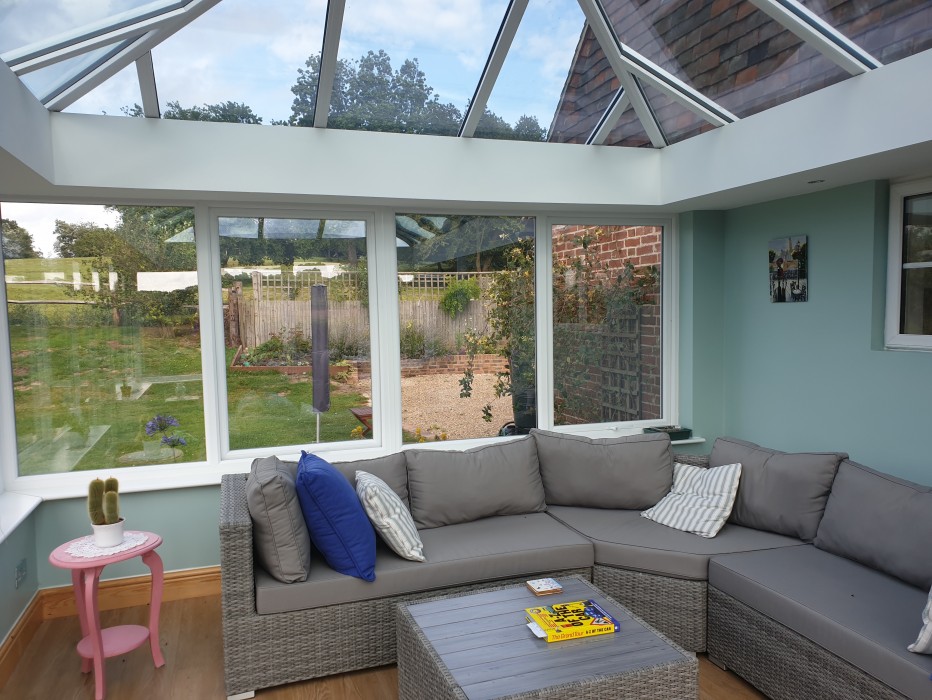 Our clients in Kent wanted somewhere to sit and enjoy their gorgeous garden and views all year round without having to worry about the British weather. We completed this conservatory build using the Durabase Steel base system, which is faster and cleaner than a conventional base system. Using the Ultraframe roof system, this customer added electric roof vents and an insulated pelmet to add thermal efficiency and an orangery feel inside. It's also a clever way of hiding lighting. Adding the decorative Cornice gutter outside gives a beautiful finish outside. With super-efficient glazing in the roof and frames and insulation in the floor, walls, and pelmet, combined with underfloor heating, this conservatory won't be too hot in the summer, or cold in the winter. Truly a place to relax with a good book or friends.